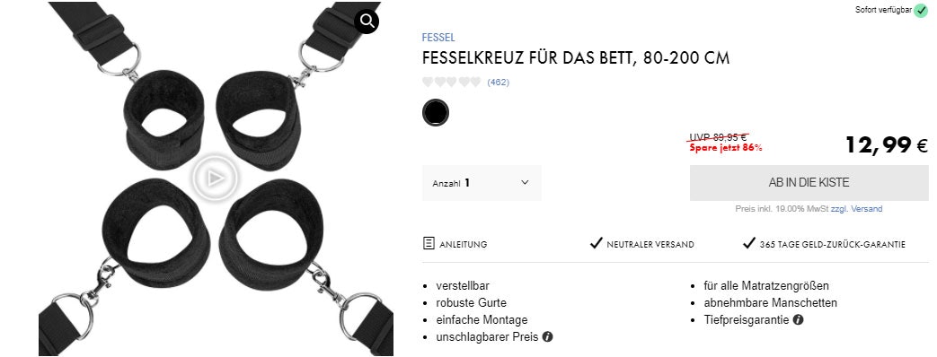 zu lesen. Kurzfristig bekommt ihr das Fesselkreuz fürs Bett für 12,99€ + 5,97€ Versand. Der OVP liegt laut eis.de bei 89,95€, bei Amazon habe ich ein ähnliches für 19,95€ + 3€ Versand gesehen. Eis.de hat also inklusive der Versandkosten den günstigsten Preis und hier bekommt ihr noch ein paar kostenlose Überraschungen dazu.