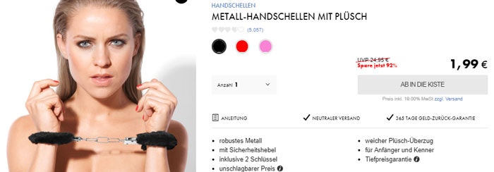 Und wem das noch nicht reicht, der holt sich einfach die Metall-Handschellen mit schwarzem, roten oder rosa Plüsch für nur 1,99€ dazu.
