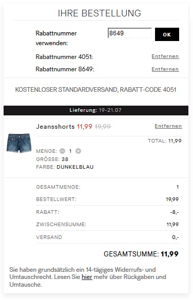 Hier seht ihr noch, dass sich der 20%-Gutschein und der Code für den kostenlosen Versand miteinander kombinieren lassen: