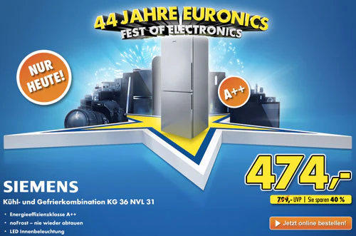 - Siemens KG36NVL31 ab 474 – bei Abholung (Preisvergleich: 584; vergleichbare Kühlschränke ab 618)