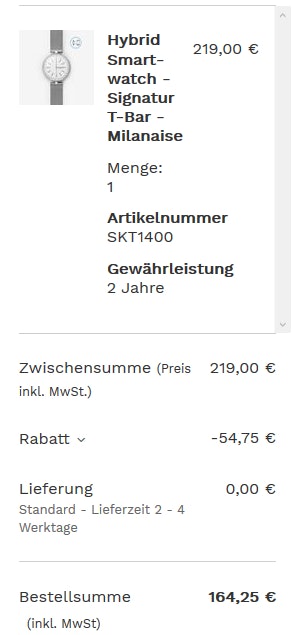 Die Promo-Code-Zauberei ist vorgehensmäßig ja immer die gleiche. 🙂 Packt die smarte Watch in den Warenkorb, geht zur Kasse und gebt den Code SKAGEN25 in das dafür vorgesehene Feld ein, sobald ihr die Möglichkeit dazu habt.