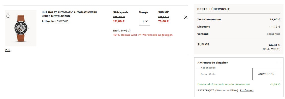 Habt ihr ein Produkt aus dem Outlet in den Warenkorb gepackt und noch den 15% Newsletter-Gutschein verwendet, dann sollte es bei euch ähnlich wie bei mir im Warenkorb aussehen: