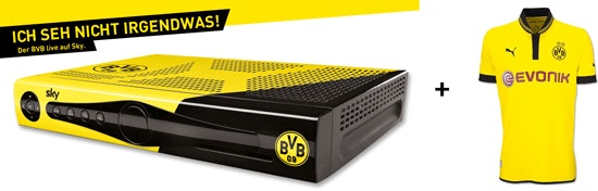 - Sky komplett inkl. HD, Sky Go und Festplattenreceiver für 34,90 monatlich mit BVB Heimtrikot (Wert: je nach Lieblingsverein zwischen 0-50)