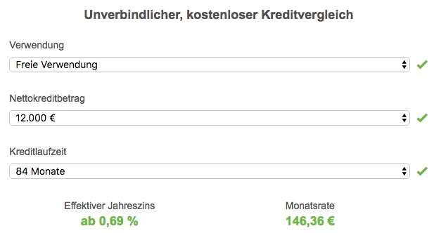 Der Zinssatz hängt vom jeweiligen Kreditbetrag ab. Los geht es bei ab effektiv 0,69% pro Jahr. Unter welchen Bedienungen sich dieser Zinssatz erhalten lässt ist allerdings unklar. Hier weichen auch die Berechnungsgrundlagen der verschiedenen Kreditgeber voneinander ab. Weiter ist für den Zinssatz die Laufzeit entscheidend. Am günstigsten kommt ihr mit einer Laufzeit von 24 bis 84 Monaten davon. Den höchsten Effektivzins zahlt ihr mit den längeren Laufzeiten bis 144 Monaten.