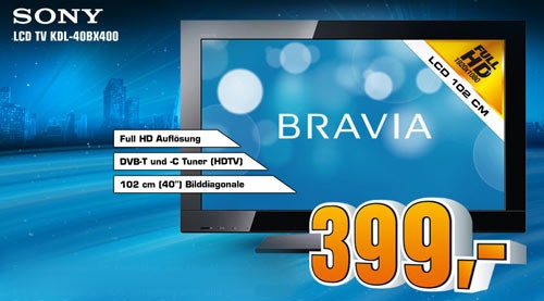 - Sony Bravia KDL-40BX400 für 399 (Preisvergleich: 459 für den sehr ähnlichen 40EX402 (mit Mediaplayer))