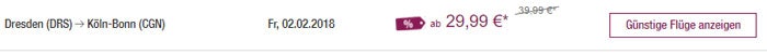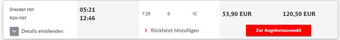 | Dresden – Köln | 2. Februar | 29,99€ | 53,90€ |