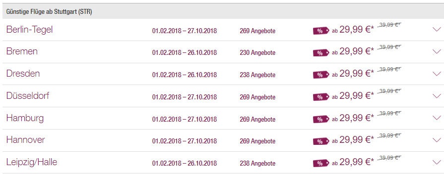 - Düsseldorf nach Berlin-Tegel, Hamburg, Leipzig, München, Nürnberg, Stuttgart, Barcelona, Bologna, Breslau, Dublin, Genf, Krakau, Mailand, Manchester, Mostar, Prag, Pula, Rom, Salzburg, Stockholm