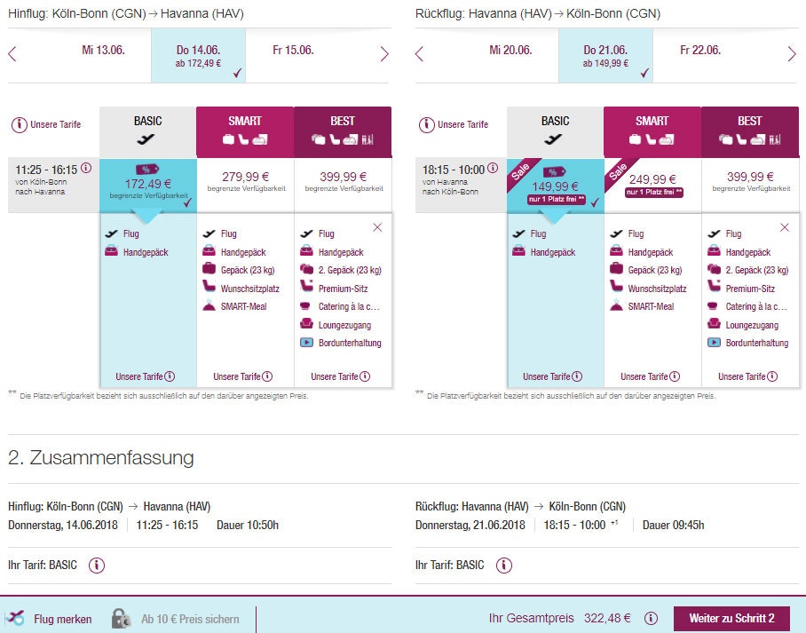 Beispiel: Köln – Havanna/Kuba im Basic-Tarif: 14. – 21. Juni (322€)