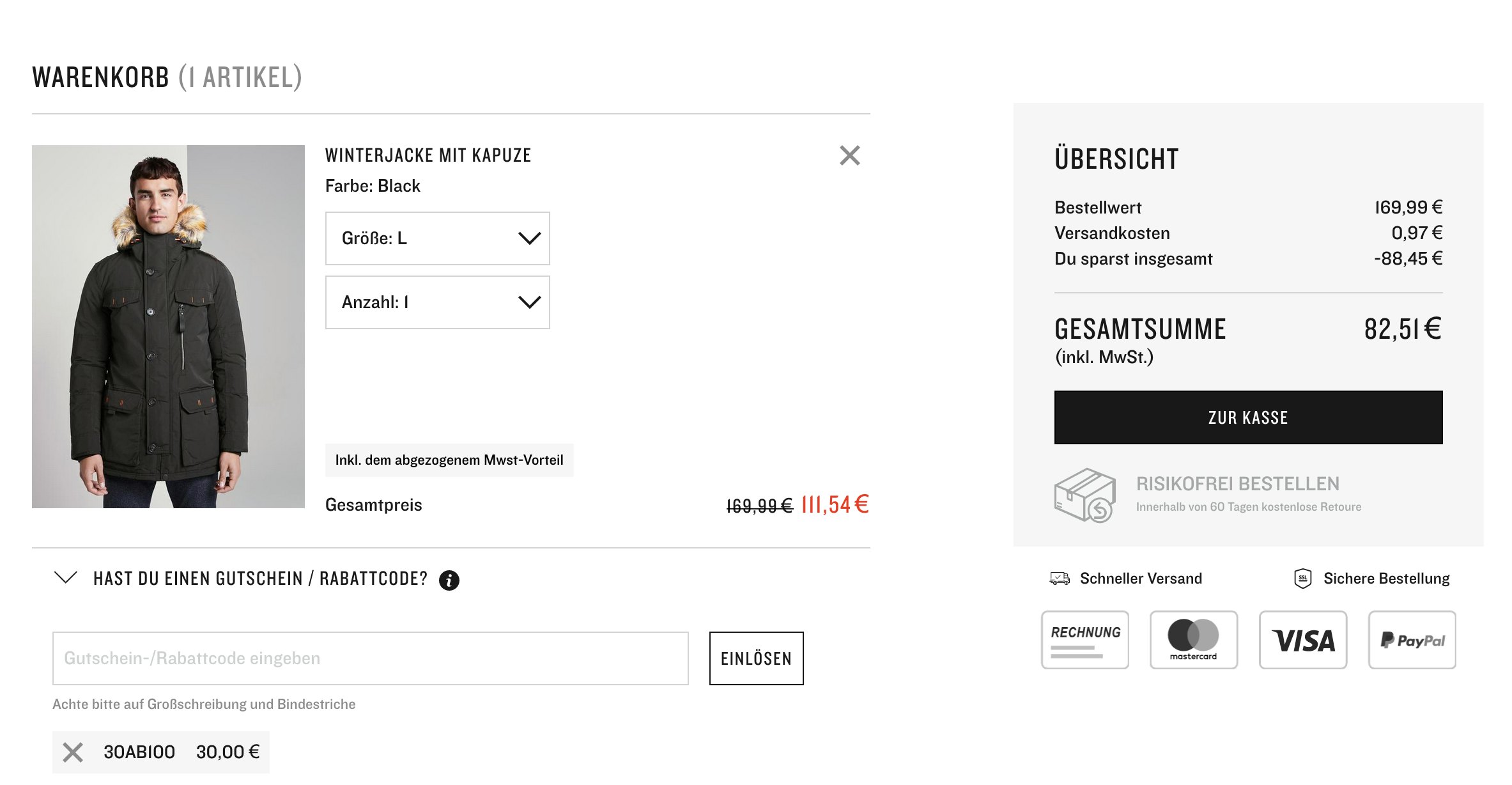 Hier seht ihr noch einen Screenshot vom Warenkorb, auf dem zu erkennen ist, dass sich die Rabattcodes auch mit bereits reduzierten Artikeln aus dem Sale kombinieren lassen.