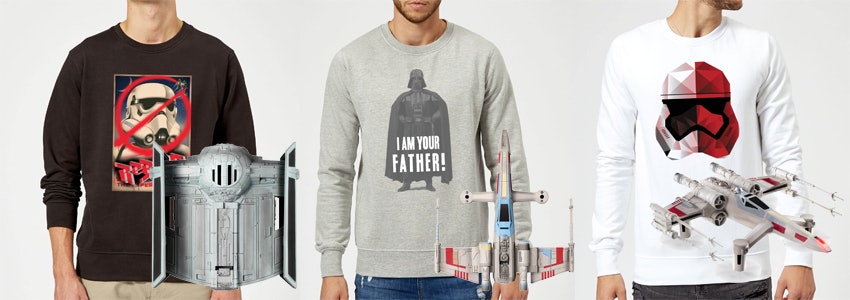 Achtung Sternenkriegsveteranen (zumindest aus der sicheren Ferne des Betrachters), auf der Zavvi-Seit habe ich gerade ein feines Textil- und Plastik-Bundle entdeckt. Zu haben sind diverse schnieke Sweatshirts, jeweils im geschnürten Bündel mit einer offiziell lizenzierten Star Wars Drohne. Für je 55 Euronen könnt ihr nach Belieben Stoff und Fluggerät kombinieren.