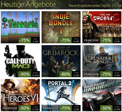 Steam rabattiert im Grunde all seine Spiele über den ganzen Zeitraum des Sales. Einige der Spiele werden dann aber zusätzlich bei den „Daily Deals“ mit bis zu 50% extra rabattiert. Es lohnt sich also, bei einem Spiel mit nur 25% zu warten, da es wahrscheinlich als „Daily Deal“ angeboten wird. Wenn nicht, kann man das Spiel am letzten Tag ja immer noch zu den aktuellen Konditionen kaufen. Heute sind folgende Games extra rabattiert: