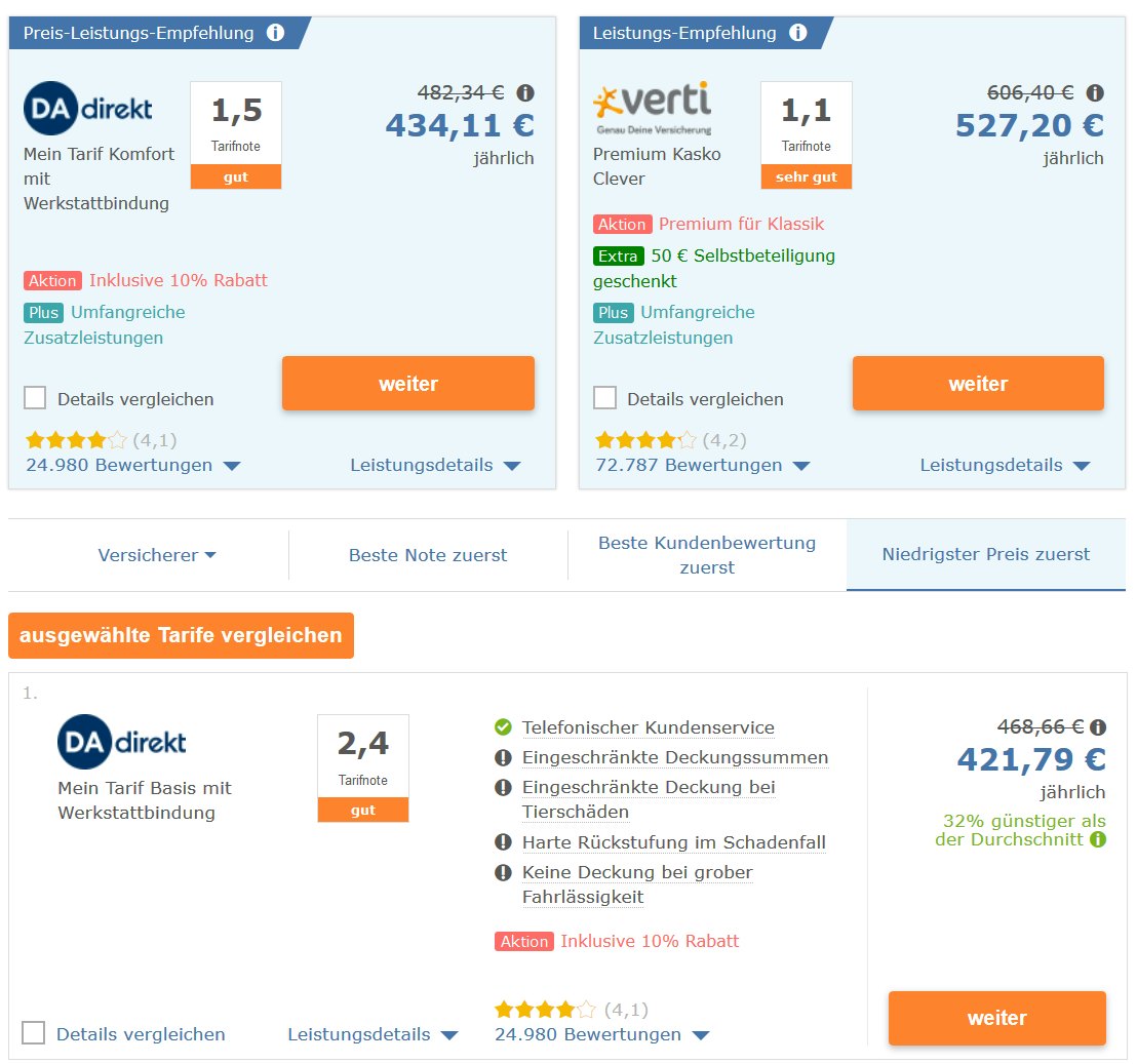 Diese Frage kann man nicht generell beantworten, da viele Faktoren im Preis und Absicherungsumfang der Versicherung mit in die Empfehlung mit hineinspielen. Unabhängig davon ist beim Wechsel der KFZ-Versicherung aber der Tarifvergleich wichtig. Wenn ihr euch in das Thema erst einmal einlesen wollt, dann empfehlen wir euch unsere Infoseite zum Thema Kfz-Versicherung wechseln. Dort haben wir versucht, alle wichtigen Fragen zu klären. Ansonsten haben wir hier die gängigen Vergleichsportale (Tarifcheck, Verivox, Nafi-Auto…) miteinander verglichen.