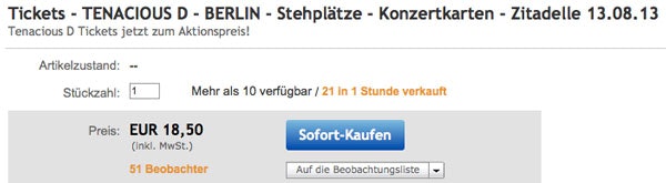 Die Konzerte von Tenacious D sind sonst immer ausverkauft, im Freundeskreis haben sogar einige die vollen 46,80 für das Konzert in Berlin gezahlt. Hier gibt es die Karten für 18,50 pro Stück. Ein echter Knaller