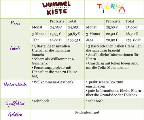 Im Vergleich zur Wummelkiste gibt es nur geringfügige Abweichungen, die Tollabox stellt ihre Helden – die „Tollas“ in den Mittelpunkt, was meiner Meinung nach spannender für Kinder sein kann. Außerdem werden auch die Eltern in Form der Elterntipps miteingebunden, was hoffentlich dazu führt, dass man zusammen spielt.