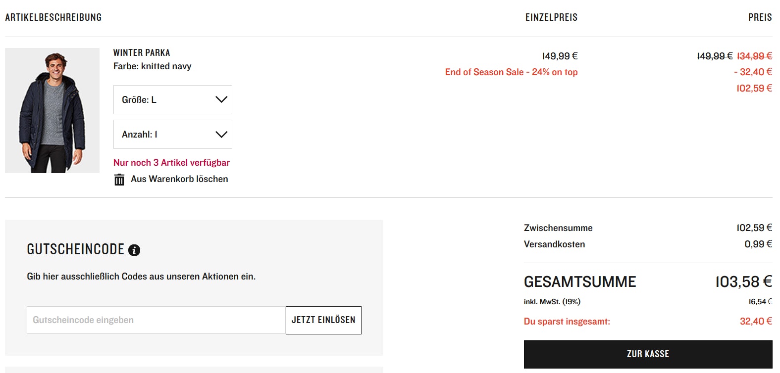 Anbei seht ihr noch einen Screenshot vom Warenkorb samt eingelöstem Gutscheincode: