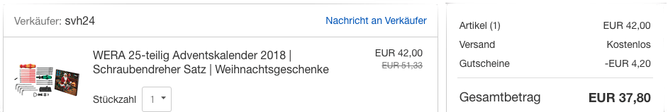 - Wera Adventskalender 2018 für 35€ inkl. Versand bei eBay.de (Preisvergleich: 39€)