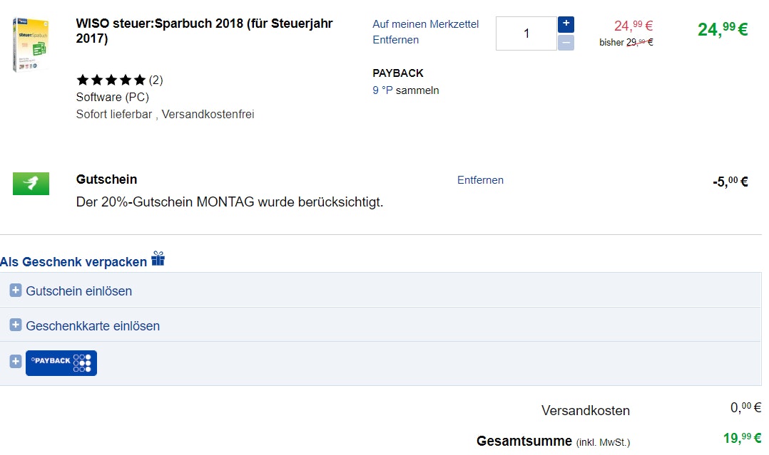 - WISO Steuer-Sparbuch 2018 für 19,99€ inkl. Versand bei Thalia.de (Preisvergleich: 24€)