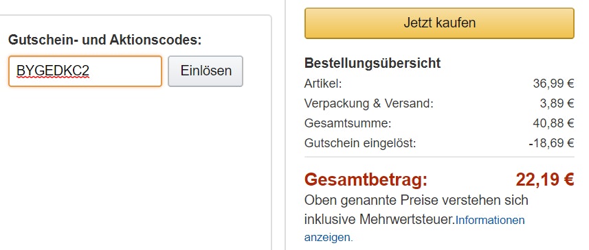 Amazon macht es euch bei diesem Deal mal wieder besonders einfach, denn ihr könnt den Gutschein direkt auf der Produktseite aktivieren. Der Rabatt wird dann automatisch an der Kasse aktiviert. Ihr könnt den Code BYGEDKC2 aber natürlich auch manuell dort eingeben.