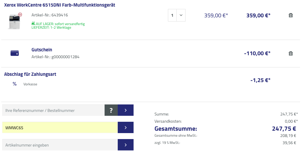 Auf den Aktionspreis kommt ihr mit dem Gutscheincode WMWC65. Zusätzlich ist Vorkasse erforderlich. Mit einer anderen Zahlungsart landet ihr dann dennoch bei einem Preis von 249€.