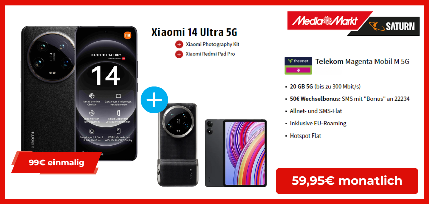 - Xiaomi 14 Ultra 5G inkl. Foto-Kit für einmalig 40€ im 70GB o2-Tarif für 39,99€/Monat bei tarife.mediamarkt.de