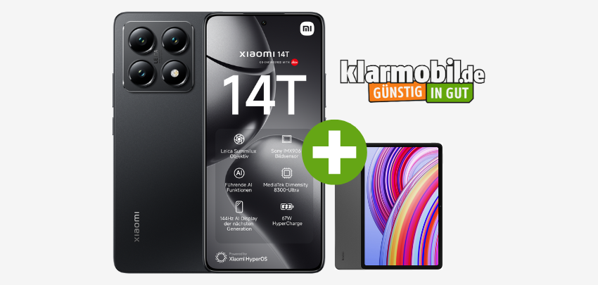 - Xiaomi 14T + gratis Tablet für einmalig 4,95€ im 20GB Vodafone-Tarif für 29,99€ mtl. bei deinhandy.de