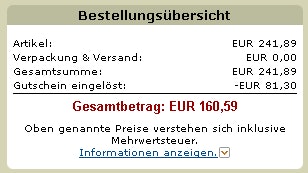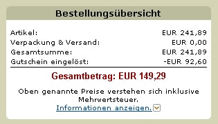 - zur Kasse gehen – Rabatt wird im vorletzten Schritt (nach Eingabe der Zahlungsdaten) angezeigt