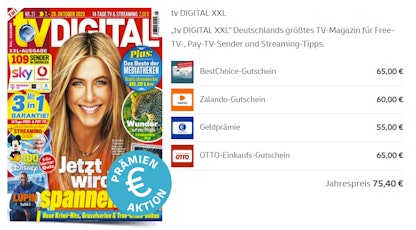 Beim Leserservice der Deutschen Post sichert ihr euch die 14-tägig erscheinende tv DIGITAL XXL im Prämienabo 12 Monate lang für einmalig 75,40€. Hinzu dürft ihr euch eine Prämie auswählen, sofern ihr das Abo in der Modalität Leser:in werben auswählt. Wahlweise könnt ihr das Abo auch für euch selbst auswählen oder an jemanden verschenken (die Prämien sind dann leider entsprechend geringer - helfen aber dennoch bei einer saftigen Ersparnis).