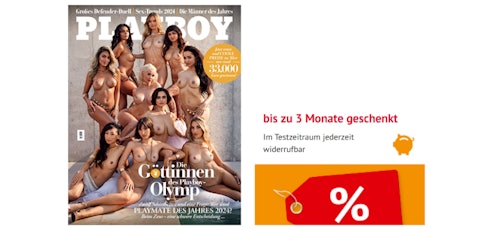 Das Magazin "PLAYBOY" ist international bekannt für viel nackte Haut und natürlich die "Bunnys". Es wird in über 30 Ländern weltweit in der jeweiligen Landessprache veröffentlicht und hat sich als führendes Erotikmagazin aus den USA etabliert. Jetzt könnt ihr es mit 3 Ausgaben testen und zahlt nichts dafür.