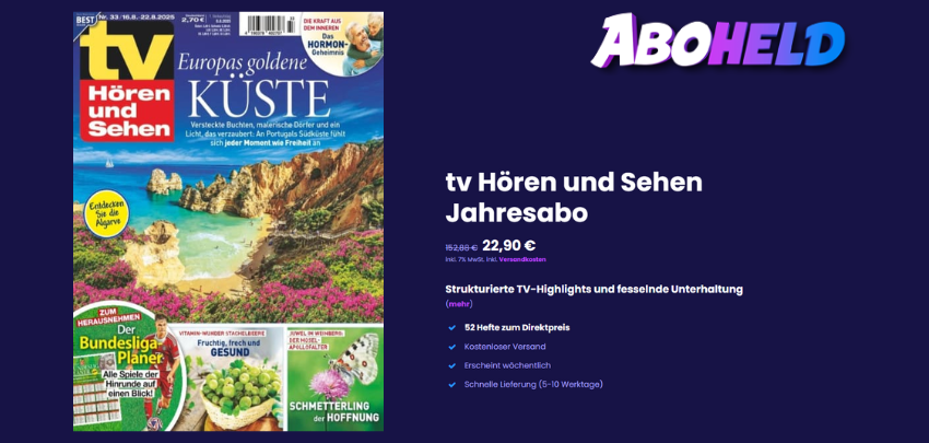 - Jahresabo TV Hören und Sehen für 22,90€ inkl. Versand bei Abhoheld.de