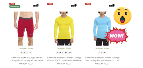 Bei diesem Deal könnt ihr euch aussuchen, ob euch aufgrund des Tiefstpreises oder wegen der Männerkörper auf den Artikelbildern schwindelig wird. 😉 Die PUMA Final evoKNIT BL Tights & Shirts sind der neueste Schrei, wenn es um Komfort und Style beim Schwitzen geht. Ob beim Kicken, Pumpen oder Sprinten, diese Teile halten euch trocken und sehen dabei noch verdammt gut aus. Und wenn ihr jetzt bei Outlet46 zuschlagt, könnt ihr das Set für schlappe 12€ abstauben, sofern ihr über einen Warenwert von 29€ kommt, denn dann spart ihr die Versandkosten.