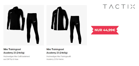 - Nike Trainingsanzug Academy 23 für 39,99€ inkl. Versand bei tactix-sports.com (Preisvergleich: 59€)