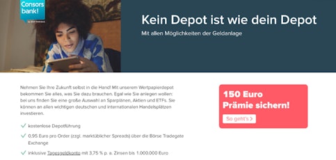 Bei der Consorsbank bekommt gerade eine fette 150€ Prämie zum kostenlosen Wertpapierdepot! Den erhaltet ihr, wenn euer Depotvolumen 8 Monate nach Eröffnung mindestens 10.000€ beträgt. Außerdem zahlt ihr nur 0,95€ pro Order über Tradegate und ein Tagesgeldkonto mit 3,5 % p.a. Zinsen bis 1.000.000€ (für 12 Monate) ist ebenfalls inklusive. Alle Infos findet ihr weiter unten!