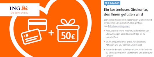 Kostenloses Girokonto mit 50€ Startguthaben bei ING.de- Bedingungen für Prämie: Gehaltskonto + 2 Gehaltsgutschriften über mind. 1.000€