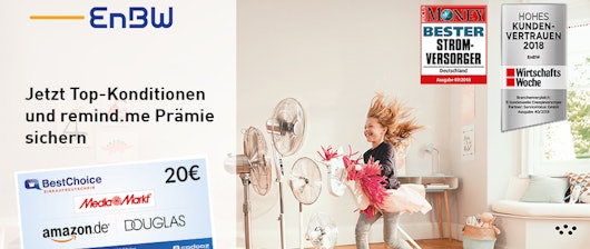 - Stromanbieterwechsel zu EnBW + 20€ Bestchoice-Gutschein als Prämie bei Remind.me