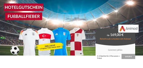 Plant pünktlich zur EM euren nächsten Kurzurlaub und erkundet die Fußball-Spielstätten: Wählt aus 100 Hotels in spannenden Destinationen in Deutschland und Europa. Eine oder zwei Nächte sind inklusive: Entscheidet euch zum Beispiel für eine Nacht im 4* Superior Hotel in Berlin oder zwei Nächte im kuscheligen Doppelzimmer am Rothaarsteig. Wellness-, Aktivurlaub oder Städtetrip - euch steht die volle Auswahl! Bis zum 30.06. könnt ihr euch eines von 12 Original Trikots der Top-Teams sichern!