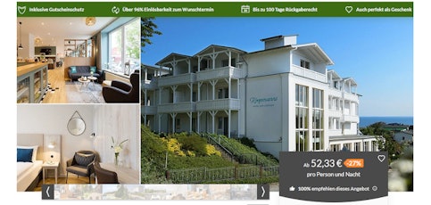 Wie wäre es mit einem Trip nach Göhren auf Rügen an der Ostsee? Mit diesem Animod-Angebot könnt ihr im nostalgischen 3* Koopmanns Hotel übernachten, ab 52,33€ pro Person und Nacht, inklusive (Langschläfer-) Frühstück. Buchbar für 3, 5 oder 7 Nächte.