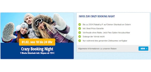 Bei Snowtrex gibt es heute von 18 bis 24 Uhr mal wieder die Crazy Booking Night. Bucht sehr günstige Angebote für diverse Skireisen inkl. Skipass ab 119€ pro Person. Die Anreise und Verpflegung muss man sich wie immer selbst organisieren.