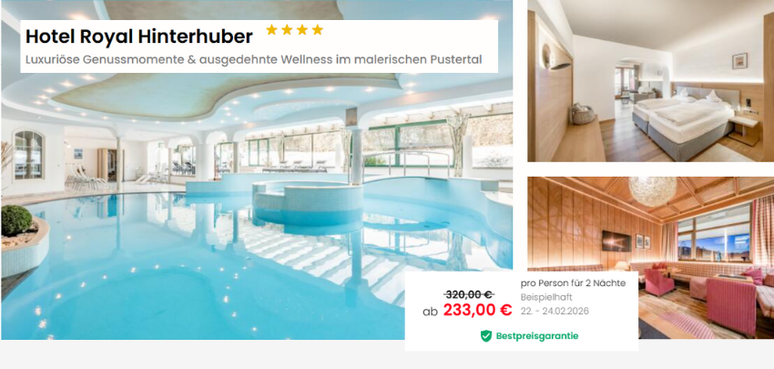 - Hotel Royal Hinterhuber für 233€ pro Person für 2 Nächte bei travelcircus.de (Preisvergleich: 320€)
