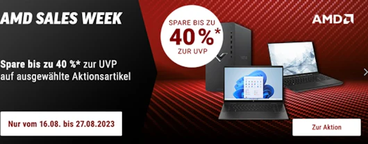 Bei Notebooksbilliger startet heute die AMD Sales Week, bei dem ihr bis zum 27. August bis zu 40% Rabatt auf die UVP sparen könnt. Wir haben die Angebote unter die Lupe genommen und euch ein paar starke Deals rausgesucht. Da aktuell zusätzlich die Rabattwoche läuft, gibt es noch tolle Gutscheine on top, was zu wirklich guten Preisen führt.