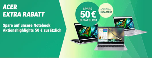 Heute startet bei NBB die Acer Rabattwoche! Ihr könnt auf über 100 Artikel, darunter Notebooks, PC-Systeme, Monitore und Beamer, bis zu 46% sparen. Zusätzlich erhaltet ihr auf 21 ausgewählte Notebooks einen Extra-Rabatt von 50€ mit dem Code NBBACER50. Die Aktion läuft bis zum 15.08.2023. Die Versandkosten liegen bei 3,99€ für Waren bis 249,99€ und 7,99€ ab 250€ Warenwert. Stöbert in der großen Auswahl und sichert euch tolle Deals!