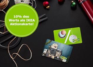Alle Jahre wieder ruft Ikea zur Weihnachtszeit die Schnäppchenjünger in seine Filialen. So bekommt ihr auch dieses Jahr beim Kauf einer Gutscheinkarte 10% als Aktionskarte kostenlos mit dazu, wodurch ihr quasi mit einem kleinen Umweg 10% auf das gesamte Sortiment bekommt. Perfekt ist die Aktion auch als Last-Minute Geschenkidee!