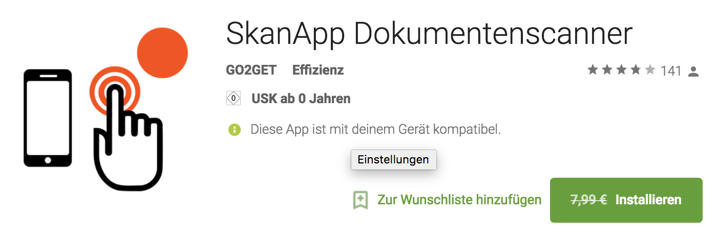 - SkanApp Dokumentenscanner kostenlos bei Play.google.com (sonst 7,99€)