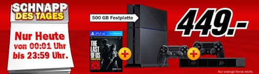 - Sony PS4 500GB+ 2. Controller + The Last Of Us + Kamera für 454 inkl FSK18-Versand bei amazon.de (Vergleichspreis: 361 + 52 + 42 + 45 = 500)
