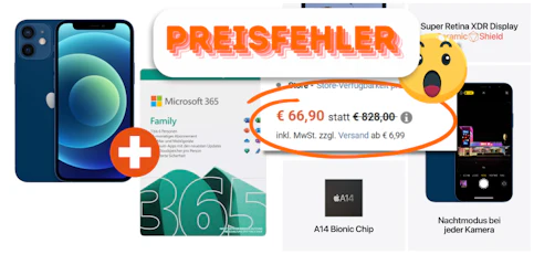 Aktuell könnt ihr das iPhone 12 zum ABSOLUTEN Schnäppchenpreis abstauben. Und zwar in der Mini-Version in Blau mit Microsoft 365 Family DL! Es handelt sich hier ganz sicher um einen Preisfehler. Viel Erfolg mit diesem Deal!