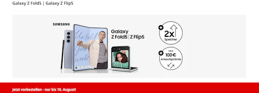 Heute, am 26. Juli, fand um 13 Uhr ein Unpacked-Event in Seoul statt, auf welchem Samsung hat eine Vielzahl an neuen Hardware-Produkten vorgestellt hat, darunter das Galaxy Z Flip 5G und das Z Fold 5G. Media Markt und Saturn bieten euch jetzt die brandneuen Smartphones zu Top-Konditionen: Bestellt sie bis zum 10.08.23 vor und profitiert von 100€ Direktabzug auf den Kaufpreis, doppeltem Speicher und einer Ankaufsprämie von mindestens 100€ für das Galaxy Z Flip5 bzw. mindestens 150€ für das Galaxy Z Fold5 beim Tausch eures Altgeräts.