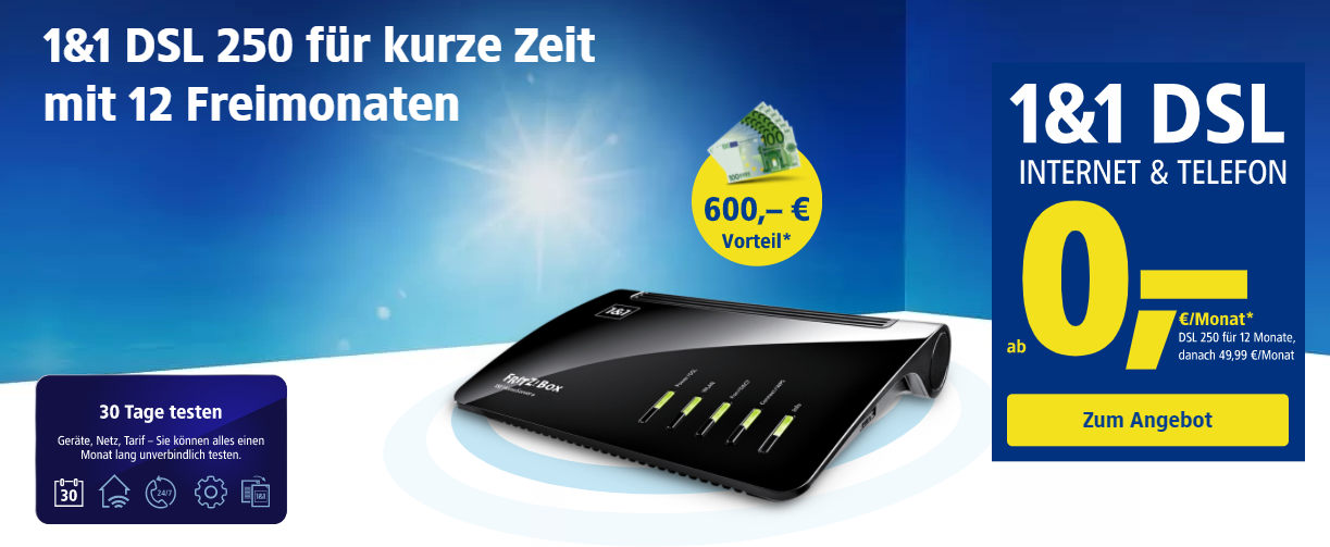 1&1 gehört zu United Internet, einem großen Unternehmen für Internetdienstleistungen. Mit einem Mobilfunkvertrag seid ihr vorerst noch im O2-Netz unterwegs, welches 1&1 mit nutzen darf. Bald beginnt aber der Ausbau des eigenen 5G-Netzes, für das sich die Firma die Lizenzen sichern konnte. Auch im Bereich DSL habt ihr in 1&1 einen guten Anbieter gefunden. Denn in immer mehr Regionen könnt ihr dank Breitbandausbau mit bis zu 1.000 Mbit/s surfen. Bevor ihr aber einen Vertrag abschließt, sucht euch den besten 1&1 Gutschein aus, der euch ein Geschenk oder Rabatt einbringen kann.