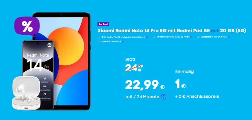 Xiaomi Redmi Note 13 Pro 5G im Allnet XL Tarif inkl. 15 GB LTE für nur 19,99 € pro Monat