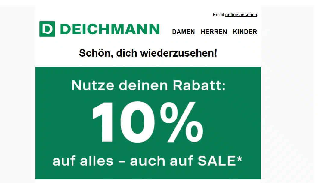 Registriert euch unten in der Fußzeile über den entsprechenden Link für den kostenlosen Newsletter-Service des Schuhhandels. Nachdem ihr eure Adresse erstmals in die Verteilerliste eingetragen habt, erhaltet ihr einen Deichmann Gutschein im Wert von zehn Prozent Nachlass als Willkommensgeschenk. Danach müsst ihr relativ schnell in die Hufe kommen und einen Einkauf tätigen, denn der Code ist nur 30 Tage lang gültig. Nutzt den Gutschein deshalb innerhalb dieser Frist einmalig ab einem Bestellwert von 30 Euro.