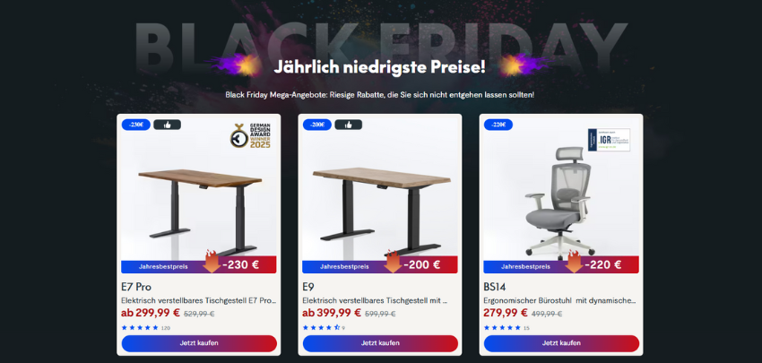 | 130€ Rabatt | 130 Euro Ermäßigung auf die verstellbare Schreibtischkollektion E7 | 25. Dezember 2025 |