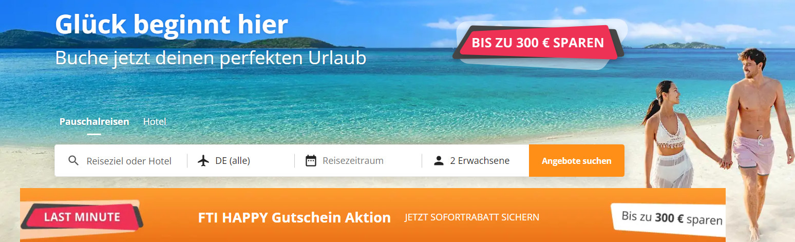 Alle aktuellen Gutscheine von FTI werden normalerweise oben in der Liste geführt. Achtet jedoch vor allem aber auch auf die Banner rechts und unten auf der Startseite des Buchungsportals, denn hier warten zusätzlich richtige Schnäppchen auf euch. Bis zu 200 Euro Ersparnis auf spezielle Reiseangebote oder 20 Prozent Nachlass auf Reisegutscheine von FTI sind hier möglich.